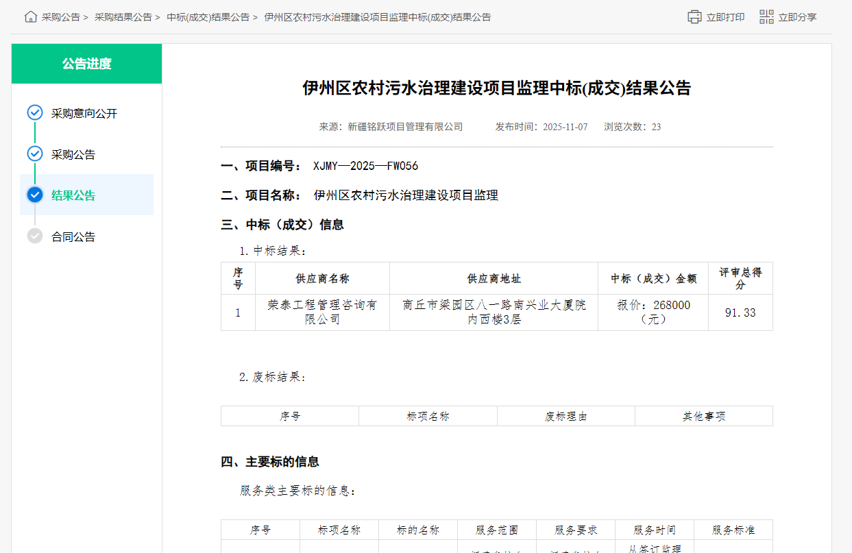 伊州区农村污水治理建设项目监理中标(成交)结果公告