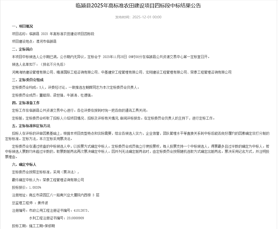 临颍县2025年高标准农田建设项目四标段中标结果公告