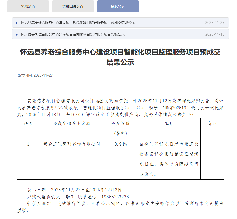 怀远县养老综合服务中心建设项目智能化项目监理服务项目(二次)询比采购公告