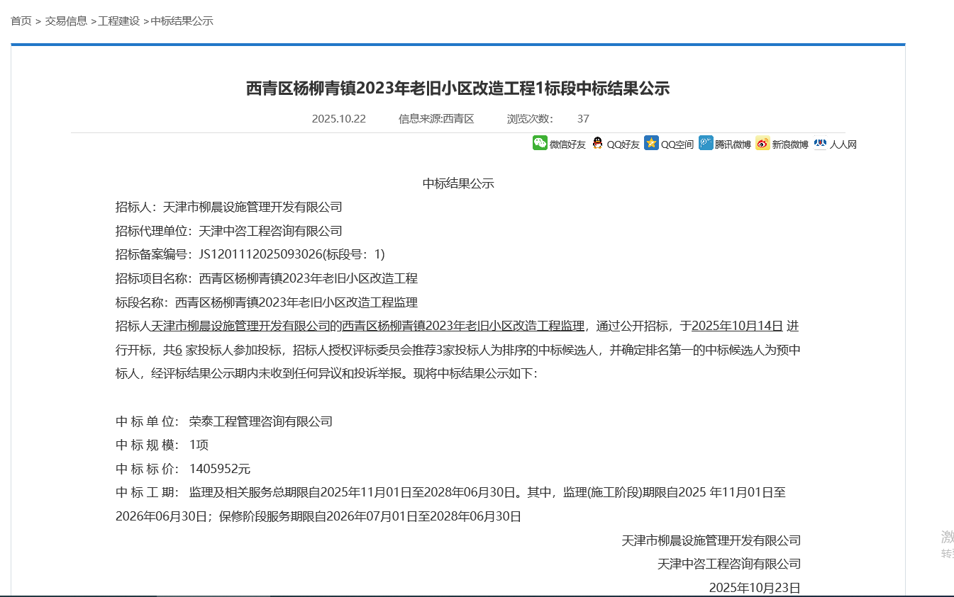西青区杨柳青镇2023年老旧小区改造工程1标段中标结果公示