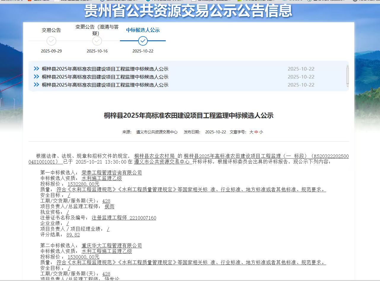 桐梓县2025年高标准农田建设项目工程监理中标候选人公示