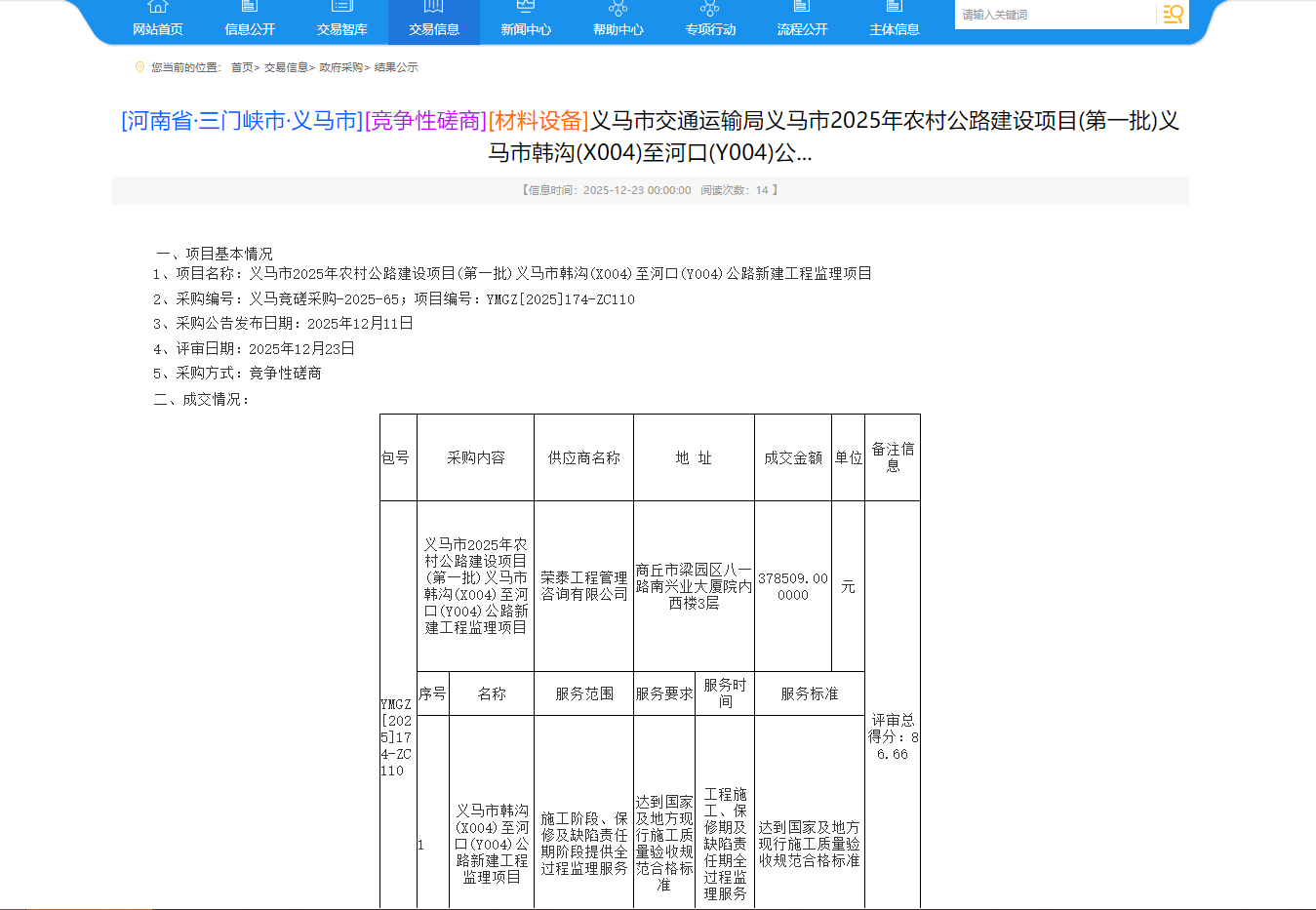 义马市2025年农村公路建设项目(第一批)义马市韩沟(X004)至河口(Y004)公路新建工程监理项目