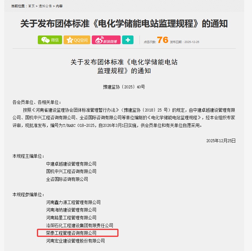 热烈庆贺荣泰工程管理咨询有限公司参与编制起草《电化学储能电站监理规程》