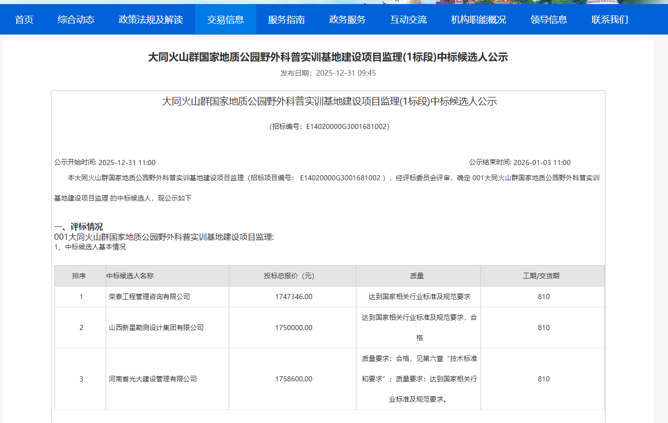 大同火山群国家地质公园野外科普实训基地建设项目监理(1标段)中标候选人公示